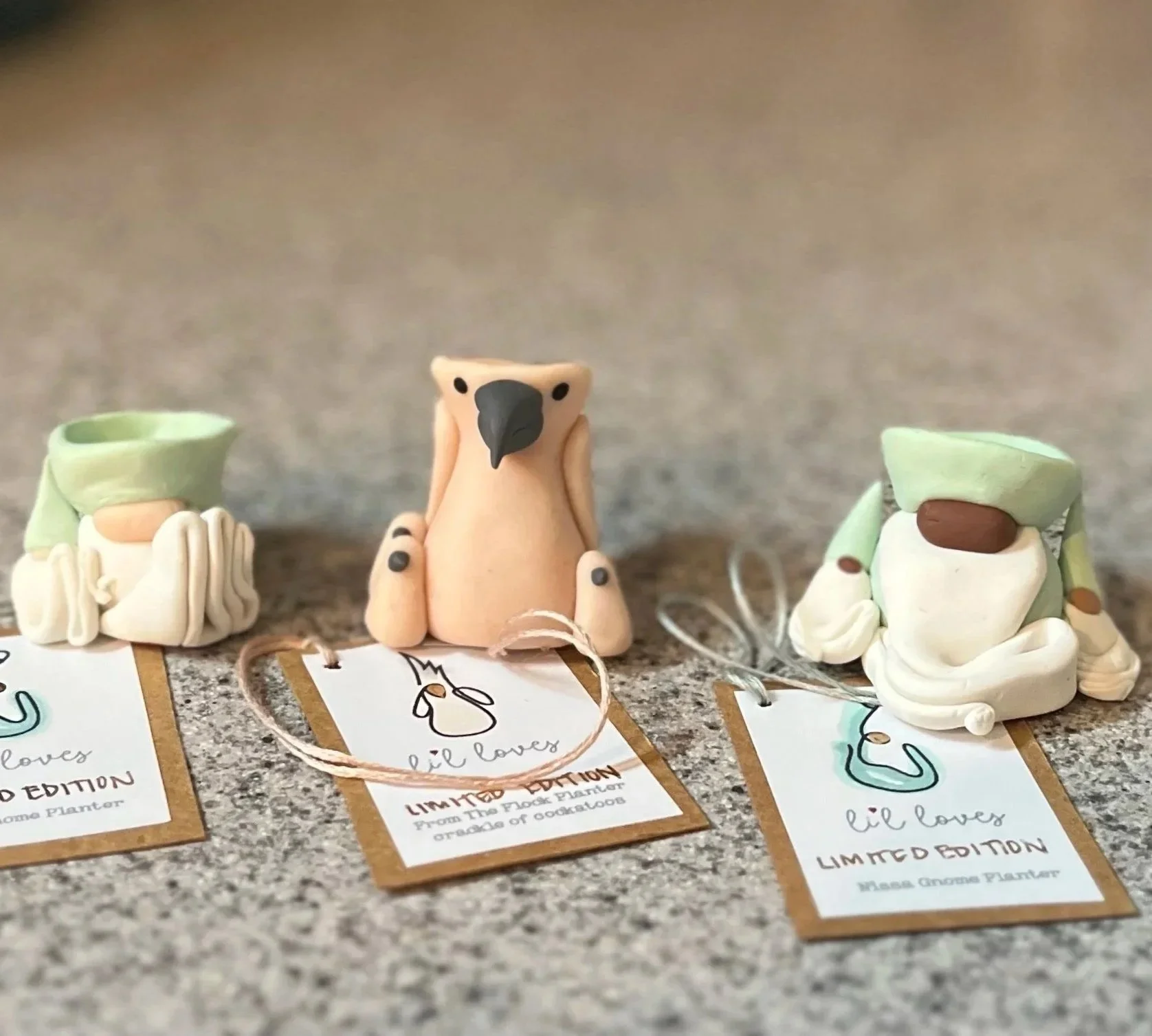 Nissa Gnome Planter from $15.00 Many Mushrooms Planter from $13.00 Cinco de Mayo Sugar Skull Planter from $20.00 Ring-Necked Dino Planter from $20.00 Custom Family of Creations from $20.00 Pod O' Whales from $15.00 Not Your Average Joe Dino from $17.00 Cackle of Cockatoos from $15.00 Friendly Neighborhood Dragon Planter from $20.00 Polar Express-O from $20.00 Lil' Bear from $10.00 Lil' Cockatoo from $5.00 Lil' Gnomie from $5.00